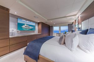 Big Sky’s interior layout sleeps 11 guests in five en-suite cabins, plus a crew of 10. The main deck offers a full-beam owner cabin with