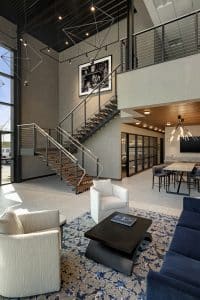 Artwork curated from David Yarrow adorns the wall near the entrance to the mezzanine level, which houses four private Jet Linx offices and offers memorable views of the Minnesota River Valley at sunset.