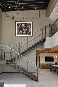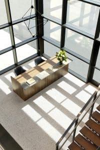 The contemporary design reflects the landscape by making use of plenty of natural materials: marble and Quartzite tabletops, walnut stairs and flooring, and plenty of natural light that penetrates a free-flowing reception area. The more modern brushed metal and custom-designed LED lighting fixtures provide a splash of eye-catching contrast.