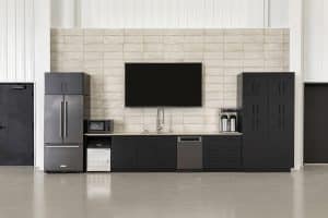 The kitchenette contains complimentary, client-preferred premium snacks and beverages. The 85-inch TV allows a crowd to view a game or presentation while catered meals can be easily served from this station.