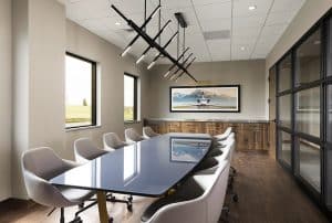 A private jet-themed artwork overlooks the custom-made conference room table (designed to resemble an aircraft wing). A marble credenza table with walnut cabinetry at the front of the space provides a platform for catering or organizing business collateral.